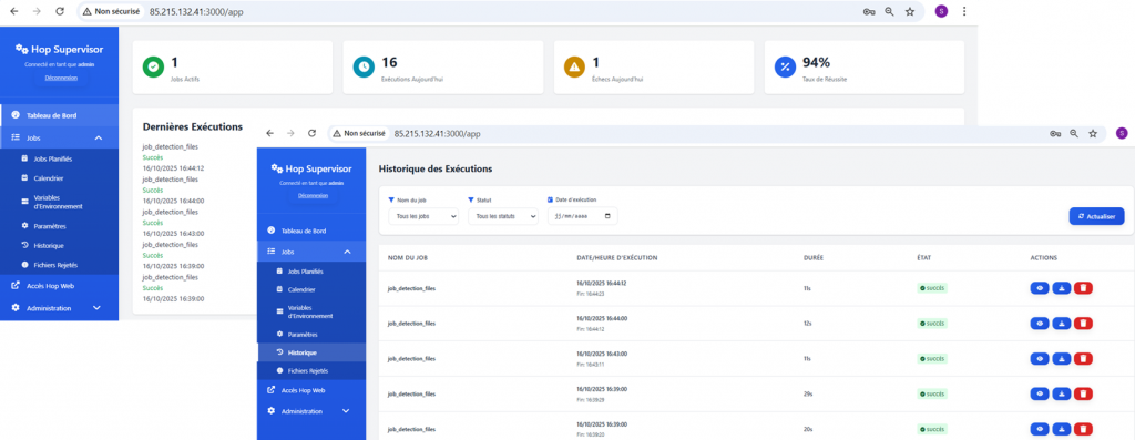 - Tableau de bord, indicateurs, jobs actifs, exécutions du jour, jobs en échec